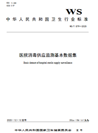前 言 本标准为推荐性标准。 本标准由国家卫生健康标准委员会卫生健康信息标准专业委员会负责技术审查和技术咨询,由国家卫生健康委统计信息中心负责协调性和格式审查,由国家卫生健康委规划发展与信息化司负责业务管理、法规司负责统筹管理。 本标准起草单位:国家卫生健康委医院管理研究所、河南省人民医院、浙江大学医学院附属邵逸夫医院、苏州大学附属第一医院、中国疾病预防控制中心环境与健康相关产品安全所、中国人民解放军总医院、国家卫生健康委统计信息中心、安阳市人民医院、河南省卫生健康技术监督中心。 本标准主要起草人:张宇、姚卓娅、王亚娟、程平、张流波、刘运喜、张黎黎、邱素红、陈悦、徐笑、梁道宝。 WS/T 879—2025 医院消毒供应监测基本数据集 1 范围 本标准规定了医院消毒供应监测基本数据集的元数据属性和数据元属性。 本标准适用于医院消毒供应中心进行消毒供应相关数据的收集、存储、共享、追溯和反馈等工作。 社会化医疗消毒供应中心可参照执行。 2 规范性引用文件 下列标准中的内容通过文中的规范性引用而构成本标准必不可少的条款。其中,注日期的引用文件,仅注日期对应的版本适用于本标准;不注日期的引用文件,其最新版本(包括所有的修改单)适用于本标准。 WS 310.1 医院消毒供应中心 第1部分:管理规范 WS/T 370 卫生健康信息基本数据集编制标准 3 数据集元数据属性 根据WS/T 370,本数据集的元数据属性见表1。 表1 数据集元数据属性