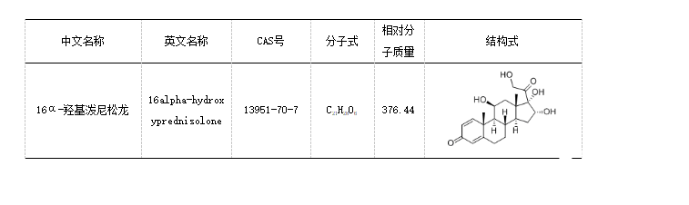 10图谱 附录A 16α-羟基泼尼松龙的相关信息 表A.1 16α-羟基泼尼松龙的中文名称、英文名称、CAS号、分子式、 相对分子质量及结构式 |