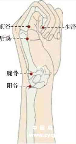 【定位】第5掌指关节尺侧远端赤白肉际凹陷中(图8-2-2)。