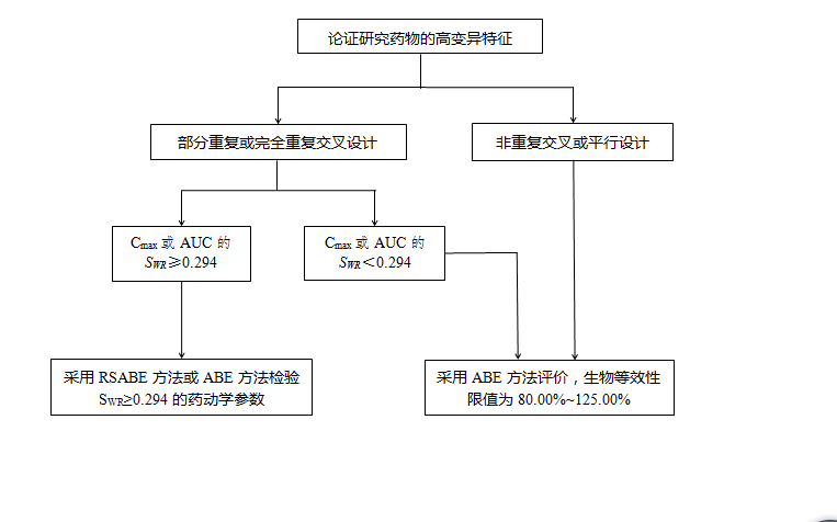 RSABE法主要分为下列三步: 1.计算参比制剂的个体内标准差(SWR) 采用部分重复或完全重复交叉设计,可获得受试者两次服用参比制剂后,主要药动学参数的个体内标准差(SWR),SWR可通过公式1计算: 若SWR≥0.294,即CVW%≥30%,可采用RSABE方法进行等效性评价(应用于AUC、Cmax两者之中任意一个或全部采用)。若SWR<0.294,即CVW%<30%,则应采用ABE方法评价生物等效性。 2.计算以下算式的单侧95%置信区间上限(Upper bound of 95% confidence interval) 3.等效性判断标准 四、报告总结与讨论研究报告撰写内容除应符合生物等效性研究的一般技术要求外,还应重点进行高变异药物特征论证、风险评估及相应的数据分析报告。 (一)高变异特征论证通常情况下,导致药物个体内高变异特征的潜在因素包括但不限于:(1)胃肠道pH值、胃肠动力、胃排空、小肠转运和结肠驻留时间等影响生物利用度的生理因素;(2)药物分布、首过代谢、全身代谢和清除等药物固有性质;(3)溶解性等原料药的理化性质;(4)药物溶出等制剂的处方因素;(5)饮食等其他因素。 采用RSABE方法前,应基于已有的文献资料、预试验结果等,充分分析参比制剂生物药剂学特征和体内过程,估算主要药动学参数(AUC和/或Cmax)的个体内变异系数,充分论证采用RSABE方法的适用性。必要时,还需通过补充相关试验加以论证。 (二)风险评估通常情况下,只有安全性较好、治疗窗较宽的高变异药物才可采用RSABE方法进行不同制剂的生物等效性的评价。由药物的固有属性、机体生理因素等引起的高变异性一般无法通过提高制剂和试验质量而消除,由于存在这种特性的参比制剂上市过程中已得到充分暴露并经过临床研究安全性和有效性证明,此时,采用RSABE方法进行生物等效性评价是可接受的。 采用RSABE方法进行统计分析,应进行严格科学的试验设计,试验通常应在同一中心完成,并应避免试验质量对个体内变异的估计引入偏倚。 对于由制剂质量或试验操作不当等原因引起的高变异,不适合采用RSABE方法。申办者应确保制剂质量的均一性及可控性,加强研究过程中的试验质量管理,并在研究报告中比较临床研究所获得的个体内变异与文献数据的差异,避免生物等效性判定标准的不当放宽。 (三)结果报告根据文献或预试验的研究结果,明确正式试验所选择的试验设计类型和生物等效性统计方法,其中包括个体内变异结果与预期有差异时的备选统计方法。生物等效性研究报告除应符合《生物等效性研究的统计学指导原则》和临床试验数据管理相关技术要求以外,若采用RSABE方法,还应提供如下信息: 五、特殊考虑