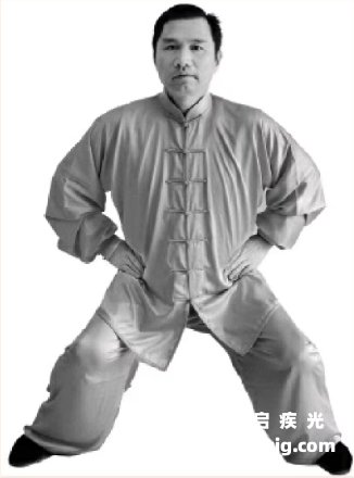 (6)瓦楞掌 四指并拢伸直,腕关节平伸,拇指伸直略内收,掌心略内凹,形似瓦楞状(图4-13)。 图4-13 瓦楞掌 (7)爪形掌 腕关节上翘,五指自然分开,将第1、2指间关节内扣弯曲成虎爪形,又称虎爪掌(图4-14)。 图4-14 爪形掌 (8)扇形掌 腕关节平伸,掌指伸直,五指用力分开成扇形(图4-15)。 图4-15 扇形掌 3.钩手 五指自然伸直,五指指端并拢在一起,腕关节自然下垂弯曲成钩形,故称钩手。动作要求五指用力并拢,腕关节尽量屈曲。钩手是推拿功法锻炼中较为特殊的一种手型,对锻炼腕关节的柔韧性和灵活性具有很好的效果(图4-16)。 图4-16 钩手 (三)基本步法 推拿功法锻炼中常用的基本步法有并步、马步、弓箭步、虚步、丁步、仆步、歇步等。长期反复锻炼,具有增强下肢肌力、霸力与持久力的功用。 1.并步 头端正,双目平视,舌抵上腭,下颏微收,定心息气,神情安详,松肩,胸微挺,直腰拔背,蓄腹敛臂。动作要求:两臂自然下垂,两脚并拢,全脚掌着地,两膝放松,两腿伸直并立(图4-17)。 图4-17 并步 2.马步 上身正直,挺胸直腰,收腹敛臀,上身下蹲。动作要求:左足向左平行分开站立,两足之距等宽或宽于两肩,足尖正对前方,脚掌着地,屈膝屈髋45°左右成半蹲式,或大腿接近90°水平状半蹲,膝稍内扣不超过脚尖,身体重心置于两脚之间,两手叉腰或抱拳于腰间(图4-18)。两脚开立与肩等宽,屈膝屈髋下蹲45°,称为小马步;两脚左右平行开立约为本人五六脚掌宽,屈膝半蹲成90°水平状,称为大马步,又称为悬裆。 图4-18 马步 3.弓箭步 上身正对前方,挺胸,直腰塌臀,前腿屈似弓,后腿直如箭,眼向前平视,两手叉腰或抱拳于腰间。动作要求:两腿前后开立,相距为本人脚掌的四五倍。脚掌着地,前腿屈膝半蹲,大腿接近水平,膝部和小腿与脚掌垂直,脚尖稍内扣;后腿挺膝蹬直,脚尖外展45°~60°,斜朝前方,前脚尖与后脚跟成一直线,两腿似前弓后箭势(图4-19)。弓右腿为右弓左箭步;弓左腿为左弓右箭步。 图4-19 弓箭步 4.八字步 上身正直,舒胸直腰,收腹敛臀。动作要求:两足左右开立,相距约本人脚掌的2倍,脚掌着地,脚跟外展,两脚尖内扣45°,呈八字形,两腿直立,身体重心落于两腿之间,称内八字步(图4-20);两脚跟内扣,足尖外展45°以上,呈八字形,两腿直立,身体重心落于两腿之间,称外八字步(图4-21)。 图4-20 内八字步 图4-21 外八字步 5.虚步 上身正直,挺胸直腰,收腹敛臀,虚实分明。动作要求:两脚前后开立,后腿屈膝屈髋下蹲,全脚掌着地,脚尖略外撇;前腿膝关节微屈向前伸出,脚尖虚点地面,身体重心落于后腿,称为虚步(图4-22)。左脚在前,脚尖虚点地面者称为左虚步;右脚在前,脚尖虚点地面者为右虚步。 图4-22 虚步 6.丁字步 上身正直,挺胸直腰,收腹敛臀,两手握拳在腰间。动作要求:一腿直立,一腿提起,足尖点地(图4-23)。称丁字步。 图4-23 丁字步 7.仆步 上身正直,挺胸直腰,沉臀。动作要求:两腿左右开弓,一腿在体侧挺直平仆,接近地面,全脚掌着地,脚尖内扣;另一腿屈膝全蹲,大腿与小腿成90°左右,臀部接近小腿,膝部与脚尖稍外展,全脚掌着地;两手抱拳于腰间,并稍向仆腿一侧转体,目视仆腿一侧前方,称仆步(图4-24)。仆左腿为左仆步,仆右腿为右仆步。 图4-24 仆步 8.歇步 挺胸,直腰,两腿并拢。动作要求:两腿交叉靠拢全蹲,一脚全脚着地,脚尖外展,另一脚前脚掌着地,膝部贴近其小腿后侧,臀部坐于后腿接近脚跟处,两手抱拳于腰间,眼向一侧前方平视(图4-25)。左脚在前为左歇步,右脚在前为右歇步。 图4-25 歇步 二、呼吸锻炼 (一)基本要求 呼吸锻炼是推拿功法锻炼中的一个重要环节。呼吸锻炼的要求是做到心平气和,在自然平和的原则指导下,尽力做到深、长、细、匀。深,指呼吸之气深达下丹田或脚跟;长,指一呼一吸的时间较长;细,指呼吸之气出入细微;匀,指呼吸之气出入均匀,无忽快忽慢现象。这里必须指出的是,深、长、细、匀的呼吸并不是每一个练功者一开始就能达到的,而是在练功过程中宁静情绪,集中意念的基础上慢慢形成的。练功者不要强求在短时间内即形成完整的深长呼吸,否则易使胸腹肌紧张,阻滞气机升降,出现气短胸闷、腹胀胁痛等症状。因此,呼吸要顺其自然。通过呼吸锻炼,使之由浅入深,由快至慢,功到自然成。 (二)锻炼方法 推拿功法锻炼中常用的呼吸锻炼方法有静呼吸法、腹式呼吸法、存想呼吸法及其他呼吸法。 1.静呼吸法 功法锻炼者在精神活动相对安静的状态下,有意识地把呼吸锻炼得柔和、细缓、均匀、深长的呼吸法,称静呼吸法。常用的静呼吸法包括自然呼吸法、数息呼吸法和深长呼吸法。 (1)自然呼吸法 是呼吸锻炼的最基本方法。在自然生理呼吸的前提下,用功法锻炼的意念活动逐步将呼吸调节得比自然生理呼吸更柔和、细缓、均匀的程度,并达到“意气相随”的境界。它包括自然胸式呼吸(呼吸时胸部随之起伏)、自然腹式呼吸(呼吸时腹部随之起伏)和自然混合呼吸(呼吸时胸腹部随之起伏,且起伏较为明显)三种基本形式。锻炼要求:呼吸要求与平时的自然生理呼吸一样,尤其是呼吸频率与深度,但用意上不一样。它要求全身放松、心神宁静地用意念逐步将呼吸锻炼至柔和、细缓、均匀的程度,做到“意气相随”。 (2)数息呼吸法 是用意念默念计数呼吸出入的次数而进行呼吸锻炼的方法。可以数呼也可以数吸,数呼是练呼,数吸是练吸,从一到十或到百,周而复始。吸气时,口齿轻闭,从鼻吸气(