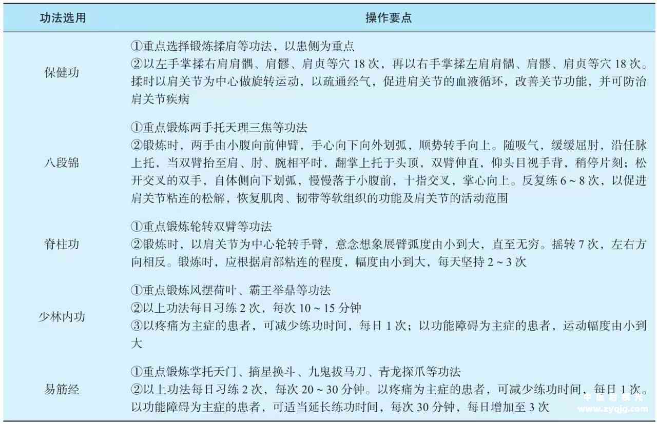 | 第三节 伤科疾病应用 一、颈部疾病 【概述】 颈部疾病主要是指颈部脊柱及其相关疾病,包括颈椎病、落枕、颈肩综合征、颈背肌风湿性肌炎等疾病。其中颈椎病是临床上最常见的颈部脊柱疾病。其成因是由于颈椎及其关节、关节囊、韧带、椎间盘退变和继发性改变,出现颈椎失稳、骨质增生、韧带钙化或关节囊肥厚,使其周围组织(神经根、椎动脉、脊髓或交感神经等)遭受不良刺激,并引起相关临床症状。颈椎病的临床表现复杂而多样,主要包括颈背疼痛、上肢无力、手臂发麻、头晕头痛、恶心、视觉障碍、吞咽困难、活动不利;心慌心悸、局部多汗、肢体发凉、血压升高或降低、耳鸣舌麻;抬腿困难、步态不稳、上肢发抖、握物困难、感觉障碍、下肢麻木无力,甚至瘫痪等。本病属中医学“痹证”“痿证”“头痛”“眩晕”“项强”等范畴。 治疗颈椎病的方法有很多,常见的有推拿、针灸、牵引、理疗、手术等。这些方法虽然有效,但远期疗效不尽如人意。临床实践表明,功法锻炼具有通督调脉、解痉止痛、平衡颈椎脊柱的功能,使颈椎间隙增宽,减轻或消除对颈神经根、颈椎动脉和其他组织的压迫,起到缓解颈背部肌肉痉挛、改善头颈部血液循环、松解粘连、调整小关节的作用。同时,可增强颈部肌肉、韧带、血管的柔韧性和弹性及颈背部肌肉力量,加强颈椎的稳定性与协调性。 【功法选用】 颈部疾病的推拿功法锻炼可选择动静结合的原则(表11-1)。首先要思想宁静,身体放松,做到心静体松,然后再选择动功锻炼。 表11-1 颈部疾病功法选用及其操作要点 【习练提要】 1.功法锻炼期间,需保持乐观情绪,积极改变不良生活习惯,避免长时间伏案低头工作,注意睡卧姿势,枕头高度适宜。 2.患者颈部症状持续不缓解或反复加剧或出现下肢症状等,应特别警惕有无颈椎椎间关节脱位及脊髓的损伤,及时进行系统检查和治疗,以免延误病情。 3.患者在功法锻炼期间,应定期对颈部功能、症状及体征进行检查和评估,以便及时调整功法锻炼计划。 二、肩部疾病 【概述】 肩部的疾病在日常生活中很常见,肩部疼痛是肩部疾病的共有症状,在临床上最常见的是肩关节周围炎,又称“冻结肩”“五十肩”“肩凝症”“漏肩风”。肩关节周围炎是以肩部软组织广泛粘连、肩部广泛疼痛和功能受限为特点的常见病,好发于50岁左右。女性较男性为多。主要由于年老体弱,肝肾亏虚,肩部劳损,复感风寒湿邪,导致肩关节囊、滑液囊、肌腱及肩周肌肉等软组织的慢性无菌性炎症,甚至肩关节粘连,引起肩关节活动功能障碍。此病早期以肩部疼痛为主,后期以肩部功能障碍为主。早期病理变化以组织充血、肿胀、渗出为主,后期以组织粘连为主。本病属中医学“肩痹”范畴。其次还有肱二头肌长头腱鞘炎、冈上肌肌腱炎、肩峰下滑囊炎、肩袖损伤等。某些慢性的损伤也会造成肩关节内盂唇的损伤,从而产生肩关节的长时间疼痛。 肩部疾病发病率逐渐增高,患者应该及时治疗。现代医学采用药物封闭、消炎止痛药物治疗,短期内有消炎止痛的效果,但对于肩部粘连,则药力不及。中医可采用松解粘连、滑利关节、活血止痛的推拿手法与针灸治疗,可收到理想效果。但治疗过程中进程缓慢,配合推拿功法锻炼,能缩短疗程,减轻患者痛苦,效果更为显著。 国内外专家已证实推拿功法可畅通气血,使肩部及背部血液运行加快,改善肩背部软组织营养的供应,调节肩背部的新陈代谢,有利于粘连的松解,促进筋骨恢复,调节人体的阴阳平衡,缓解风寒湿邪对肩部的影响,恢复人体肩关节运动功能,达到防病治病和康复的目的。 【功法选用】 肩部疾病的推拿功法锻炼遵循以动功为主、静功为辅的原则,达到松解粘连的目的(表11-2)。 表11-2 肩部疾病功法选用及其操作要点 【习练提要】 1.患者功法锻炼期间,应及时纠正不良生活习惯,注意肩部保暖,避免患肩过度劳累。 2.疼痛严重者,可在医生指导下适当服用一些镇痛药物,暂缓动功练习。 3.肩部创伤早期、肿瘤等患者应禁止采用动功锻炼,以免加重损伤。 4.患者在功法锻炼期间,应定期对肩部功能、症状及体征进行检查和评估,以便及时调整功法锻炼计划。 三、上肢疾病 【概述】 上肢在人体运动功能中充当重要的角色,人体的很多活动和动作均由上肢来完成,所以上肢容易产生劳损,尤其是肘部、腕部、手部活动机会较多,更易发生慢性损伤。目前,上肢疾病多见网球肘、学生肘、矿工肘、桡骨茎突部狭窄性腱鞘炎、桡侧伸腕肌腱炎、腕部劳损、腕管综合征、指部腱鞘炎等。常见症状有肘关节内外侧疼痛和压痛,疼痛可沿前臂向手放射,前臂肌肉痉挛,肘或腕关节僵硬或活动受限,甚至造成手掌的感觉与运动障碍,或手指发麻,经常指关节疼痛,夜间疼痛加剧,甚至使患者从梦中痛醒等。 上肢疾病临床常采用针灸、推拿、药物、封闭、理疗等方法治疗,可起到一定的效果,而功法锻炼对于巩固疗效、改善功能、促进上肢疾病康复等效果更显。 【功法选用】 上肢的功法锻炼以动功为主,可增强手指的肌力和耐力,改善上肢骨关节的柔韧性和软组织弹性,促进上肢疾病康复。动功主要选择易筋经、少林内功、八段锦(表11-3)。 表11-3 上肢疾病功法选用及其操作要点 【习练提要】 1.患者功法锻炼期间,应积极休息,有利于上肢劳损修复。 2.上肢筋伤急性期、