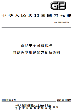 前言 本标准代替 GB29922—2013《食品安全国家标准 特殊医学用途配方食品通则》。 本标准与 GB29922—2013相比,主要变化如下: ——修改了术语和定义; ——修改了感官要求描述; ——修改了原料要求描述; ——修改了全营养配方食品营养成分的技术要求:增加了产品类别;修改了能量计算要求;增加了部分可选择性成分;修改了部分营养素的最小值或最大值;更新了检验方法标准编号; ——调整了特定全营养配方食品的目录; ——修改了非全营养配方食品营养成分的技术要求:增加了产品类别;修改了常见非全营养组件、常见非全营养配方产品的技术指标; ——污染物限量、真菌毒素限量、致病菌限量引用通用标准; ——修改了附录:新增附录 A“部分1岁~10岁人群部分营养调整型全营养配方食品”及其技术要求;修订了附录 B“常见特定全营养配方食品”目录;修订了附录 C“可用于特殊医学用途配方食品的氨基酸”。 GB 29922-2025 食品安全国家标准 特殊医学用途配方食品通则 1范围 本标准适用于1岁以上人群的特殊医学用途配方食品。 2 术语和定义 2.1 特殊医学用途配方食品 为了满足进食受限、消化吸收障碍、代谢紊乱或特定疾病状态人群对营养素或膳食的特殊需要,专门加工配制而成的配方食品。该类产品必须在医生或临床营养师指导下,单独食用或与其他食品配合食用。 2.2 全营养配方食品 可作为单一营养来源满足目标人群营养需求的特殊医学用途配方食品,包括适用于 1岁~10岁人群的全营养配方食品、适用于10岁以上人群的全营养配方食品、部分营养调整型全营养配方食品。 2.3 特定全营养配方食品 可作为单一营养来源能够满足目标人群在特定疾病或医学状况下营养需求的特殊医学用途配方食品。 2.4 非全营养配方食品 可满足目标人群部分营养需求的特殊医学用途配方食品,不适用于作为单一营养来源,包括非全营养组件(营养素组件、增稠组件、膳食纤维组件)、非全营养配方(电解质配方、流质配方、术前碳水化合物配方、氨基酸代谢障碍配方)、特定疾病非全营养配方食品及其他等类别。 3 技术要求 3.1 基本要求 3.1.1 特殊医学用途配方食品的配方应以医学和(或)营养学的研究结果为依据,其安全性及临床应用(效果)均需要经过科学证实。 3.1.2 特殊医学用途配方食品的生产条件应符合国家有关规定。 3.2 原料要求 3.2.1 特殊医学用途配方食品中所使用的原料应符合相应的安全标准和(或)相关规定,禁止使用危害食用者健康的物质。 3.2.2 适用于1岁~10岁人群的产品不应使用氢化油脂。 3.3 感官要求 感官要求应符合表1的规定。 表1 感官要求
