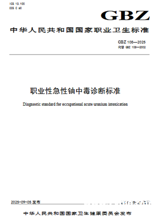 108—2002,本次为第二次修订。 GBZ 108—2025 急性铀中毒诊断标准 1 范围 本标准规定了职业性急性铀中毒的诊断。 本标准适用于天然铀或低浓缩铀职业性急性摄入人员铀中毒的诊断。 2 规范性引用文件 下列文件中的内容通过文中的规范性引用而构成本标准必不可少的条款。其中,标注日期的引用文件,仅该日期对应的版本适用于本标准;不注日期的引用文件,其最新版本(包括所有的修改单)适用于本标准。 GB/T 16141 放射性核素的α能谱分析方法 EJ/T 296.2 尿中微量铀的测定 紫外光液体荧光法 WS/T 549 尿中总铀和铀-235/铀-238比值的分析方法