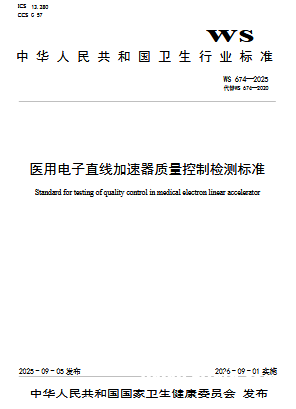 G.2.5,2020 年版的 6.9)。 本标准由国家卫生健康标准委员会放射卫生标准专业委员会负责技术审查和技术咨询,由中国疾病预防控制中心负责协调性和格式审查,由国家卫生健康委职业健康司负责业务管理、法规司负责统筹管理。 本标准起草单位:中国疾病预防控制中心辐射防护与核安全医学所、北京大学肿瘤医院、北京市疾病预防控制中心、中国医学科学院肿瘤医院、中国人民解放军总医院、中国医学科学院放射医学研究所、河南省第三人民医院(河南省职业病医院)。 本标准主要起草人:程金生、李明生、吴昊、冯泽臣、刘雅、戴建荣、鞠忠建、翟贺争、田源、张钦富。 本标准及其所代替标准的历次版本发布情况为: ——GB 16369—1996; ——GBZ 126—2002; ——GBZ 126—2011; ——WS 674—2020。 WS 674—2025 医用电子直线加速器质量控制检测标准 1 范围 本标准规定了医用电子直线加速器防护性能和质量控制检测的一般要求、检测项目及技术要求。 本标准适用于医用电子直线加速器防护性能和质量控制检测。 环形机架加速器、医用电子回旋加速器和术中放疗直线加速器等可参照执行。 2 规范性引用文件 下列文件中的内容通过文中的规范性引用而构成本标准必不可少的条款。其中,注日期的引用文件,仅该日期对应的版本适用于本标准;不注日期的引用标准,其最新版本(包括所有的修改单)适用于本标准。 GB 9706.201 医用电气设备 第2-1部分:能量为1 MeV至50 MeV电子加速器基本安全和基本性能专用要求 GB 15213 医用电子加速器 性能和试验方法 WS 582 X、γ射线立体定向放射治疗系统质量控制检测规范 3 术语和定义 GB 9706.201和GB 15213界定的以及下列术语和定义适用于本标准。 3.1正常治疗距离 normal treatment distance;NTD X射线治疗时,为从靶的前表面沿辐射束轴至等中心的距离;电子线治疗时,为电子窗沿辐射束轴至限束器末端或规定平面的距离。 3.2等中心 isocenter 放射学设备中,各种运动的基准轴线在运动过程中所围绕的公共中心点。 3.3标称能量 nominal energy 由制造商给出,用于表征辐射束的能量。 3.4均整度 flatteness 在一个照射野的限定区域内,最高与最低的吸收剂量之比,用来量度某一规定照射距离处照射野内各点吸收剂量率是否均匀。 3.5患者平面 patient plane 用医用电子直线加速器对患者进行治疗时,在正常治疗距离处与治疗床平面平行、与治疗床垂直距离为7.5 cm的平面。 3.6 M区