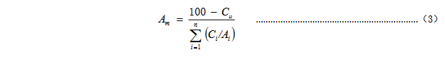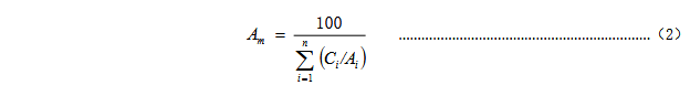 6.2 急性毒性评估应使用加和公式,计算混合物的急性毒性估计值(ATE),以确定混合物的急性毒性类别,加和公式见公式(2)。 式中: Am ——混合物的 ATE; Ci ——成分 i 的质量百分数; n ——n个组分; i ——第 i 个组分,从 1 到 n; Ai ——成分 i 的 ATE。 计算时应优先使用各混合物的急性吸入毒性 LC50 参数计算混合物的 ATE,并根据表 1 划分类别。当混合物中各物质 LC50 参数不可获得的情况下,可用急性经口 LD50 计算混合物的 ATE。 当混合物中含有 x%(x≥1)的成分无任何有用的毒性资料,无法确定其急性毒性估计值时,应根据已知成分对混合物进行分类,并附加说明混合物含有 x%的毒性未知的成分。当 x%>10%时,需要对加和性公式进行修正,见公式(3)。 式中: Cu ——急性毒性未知成分的质量百分数之和; Ci ——成分 i 的质量百分数; n ——n 个组分; i ——第 i 个组分,从 1 到 n; Ai ——成分 i 的 ATE; Am ——混合物的 ATE。 6.3 混合物扩散性与蓄积性根据各组分该分项指标类别最高的确定。 6.4 在确定各分项指标类别后按公式(1)计算毒物危害指数。 | ||||||||||||||||||||||||||||||||||||||||||||||||||||||||
