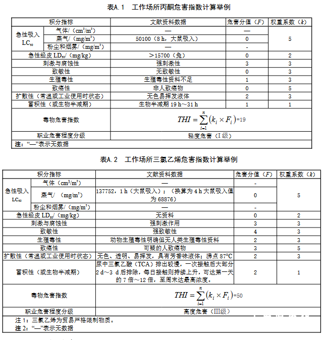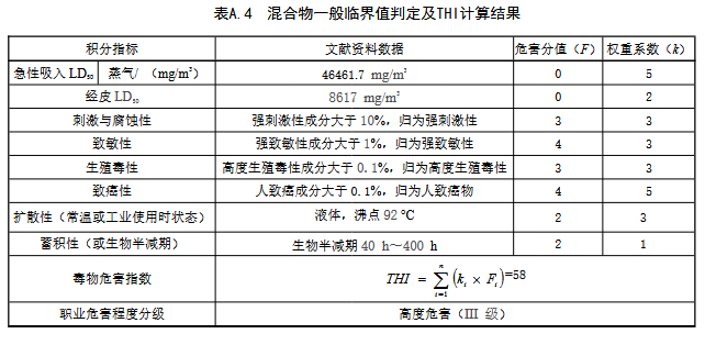 附 录 A (资料性) 正确使用本标准的说明 A.1 制定本标准的目的及注意事项 A.1.1 本标准是工作场所毒物危害程度分级的技术依据,也是工作场所职业病危害分级-有毒作业分级和职业病危害分类管理的重要技术依据。本标准适用于常见工作场所毒物的分级,也是职业卫生监督管理部门实施职业卫生分类管理、职业卫生技术服务机构开展职业病危害评价的重要技术法规依据。 A.1.2 本标准应由受过职业卫生专业训练的专业人员使用。 A.1.3 本标准是基于科学性和可行性制定的,是综合分析各种影响毒物危害程度的指标得出的分级标准,它所规定的界值不能理解为职业危害程度分级的精确界限。 A.1.4 本标准是对工作场所毒物自身的毒性做出分级,工作场所化学物职业危害分级除自身毒性外,还应结合化学物暴露环境、在空气中的浓度、体力劳动强度,按照GBZ/T 229.2的要求进行分级。 A.2 数据来源及取舍 A.2.1 各项指标分级的依据是可获得的可靠的科学数据,数据应用的优先顺序依次为:GHS 分类数据、国家技术标准、国际组织正式颁布的文件(数据)、区域组织或其他国家的官方数据、教科书、文献资料。 A.2.2 急性毒性指标按 GHS 规定分级、赋分。评估吸入毒性依据首选试验动物为大鼠或小鼠;评估急性皮肤毒性依据首选试验动物为大鼠或兔子。如果缺乏首选试验物种的急性毒性数据,而有多个其他动物物种的急性毒性试验数据,则应科学判断,在有效、良好规范的试验中选出最适当的急性毒性数据。 A.2.3 急性吸入毒性以 4 h 暴露试验为基础,根据 1 h 暴露试验获得的现有吸入毒性数据的转换,对于气体和蒸气,应除以因子 2;对于粉尘和烟雾,应除以因子 4。根据 2 h 暴露或 3 h 暴露试验获得的吸入毒性数据的转换,参照 1 h 暴露试验数据转换方法处理。 A.2.4 本标准分级依据的部分指标是动物试验数据,如果所获得的数据不一致时,应以可赋予较高分值的数据为准。例如:某毒物(蒸气)的 LC50 有两个数据,一个是 450 mg/m3,另一个是 550 mg/m3, 按分级标准,前者应划分为类别 1,赋 4 分;后者应划分为类别 2,赋 3 分。因此,应以前者为准,釆用 450 mg/m3 这一数据。 A.2.5 蓄积性包括物质蓄积和功能蓄积。蓄积性一般用蓄积系数表示,但生物半减期也反映物质的蓄积性。本标准把蓄积系数和生物半减期两个指标均作为分级依据。当有蓄积系数数据可用时,按蓄积系数分级;没有蓄积系数数据可用时,按生物半减期分级;如果毒物的毒性作用由其代谢产物引起的,则按该代谢产物的生物半减期分级。 A.2.6 本标准各项指标的分级标准是依据现有可获得数据、资料制定的,这些依据也将随着科学研究的深入而发生变化,因此,应用本标准时应注意最新的科学研究成果。 A.3 应用举例 A.3.1 单一化合物危害指数计算 毒物危害指数是影响毒物危害程度各项指标的综合加权积分值,综合反映工作场所毒物对劳动者健康危害程度的可能性,不能理解为工作场所毒物的实际危害程度。毒物危害指数计算举例见表A.1和表A.2。 A.3.2 混合物的危害指数分级 例:某清洗剂成分为甲苯(含量25%)、正己烷(22%)、庚烷(38%)和三氯乙烯(15%),计算该毒物的THI指数,并分级。各化合物的指标数据见表A.3。 A.3 各化合物的指标数据