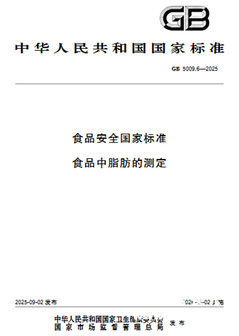 食品中污染物限量》(GB 2762-2025)等32项食品安全国家标准和2项修改单的公告(2025年 第6号) 第22项 前言 本标准代替 GB 5009.6-2016《食品安全国家标准食品中脂肪的测定》本标准与 GB 5009.6-2016 相比,主要变化如下: ——修改了第一法 索氏抽提法、第二法 酸水解法、第三法 碱水解法和第四法盖勃法的适用范围; ——增加了第一法 素氏抽提法、第二法 酸水解法、第三法 碱水解法的试样制备方式; ——规定了第一法 素氏抽提法中油料样本的精密度; ——修改了第二法 酸水解法的提取溶剂; ——增加了第四法 盖勃法中硫酸的体积分数。 GB 5009.6-2025 食品安全国家标准 食品中脂肪的测定 1范围 本标准规定了食品中脂肪含量的测定方法。 本标准第一法 索氏抽提法适用于食品中游离态脂肪的测定。 本标准第二法 酸水解法适用于食品中脂肪的测定(乳及乳制品除外)。 本标准第三法 碱水解法适用于乳及乳制品、特殊膳食用食品、蛋白饮料中脂肪的测定。 本标准第四法 盖勃法适用于生乳、灭菌乳、巴氏杀菌乳中脂肪的测定。 第一法 索氏抽提法 2原理 试样直接用无水乙醚或石油醚等溶剂抽提后,蒸发除去溶剂,干燥,得到游离态脂肪的含量。 3试剂和材料 除非另有说明,本方法所用试剂均为分析纯,水为 GB/T 6682 规定的三级水。 3.1试剂 3.1.1无水乙醚(C4H10O) 3.1.2石油醚(CnH2n+2):石油醚沸程为 30℃~60 ℃。 3.2 材料 3.2.1石英砂。 3.2.2脱脂棉。 4仪器和设备 4.1匀浆机。 4.2组织粉碎机或研磨机。 4.3索氏抽提器。 4.4恒温水浴锅。 4.5分析天平:感量为 0.001g和 0.0001g. 4.6电热鼓风干燥箱。 4.7千燥器:内装有效干燥剂如硅胶。 4.8滤纸筒。 4.9蒸发皿。 5分析步骤 5.1试样制备 无颗粒且均匀液体样品直接摇匀后备用,有颗粒或非均匀液体样品、半固体样品用匀浆机混匀后备用,固体样品使用组织粉碎机或研磨机粉碎混匀后备用,冷冻饮品可适当加热熔融,并趁热充分搅拌均匀后备用。所制试样应尽快测定。 注:油料试样,需经 105 ℃士2 ℃烘干1h后粉碎,并通过孔径为 0.425 mm 的筛网。 5.2试样处理 5.2.1固体试样:称取均匀试样2