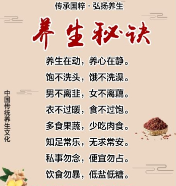 二、戒私欲:养生求静,使身心处于万虑皆息独存一念的境地,也要求人具有高尚的情操,心胸坦荡。孙思邈说:“人不终眉寿,或致夭殁者,皆由不自爱惜,竭情尽意,邀名射利。”故善养生者“勿汲汲于所欲”,“心无妄念”,“所至之处,勿得多求”,“旦起欲专言善事,不欲先计较钱财”。 三、远房室:指性生活有节制。人的生长发有赖于肾精,肾精充盈则生生不息,人的生命活力和抗病能力强。欲保肾精,必须节制性软,倘贪色好艳,纵欲无度,势必损精害体折寿。 四、适四时:人生活在自然之中,顺应季节气候是养生学的重要内容。《吕氏春秋》说:“年寿得长者,非短而续之也,毕其数也,毕数之务,在乎去害。”所谓害,就是指非其时而有其气以及大寒、大热、大燥、大温等反常气候,中医称为“六淫”。 五、节饮食:脾胃为后天之本,饮食不节,伤及脾胃,就使人多病早衰。《内经》对饮食不节的危害,有“阴之所生,本在五味”,“饮食自倍,肠胃乃伤”,“多食盐,则脉凝泣变色,多食苦,则皮枯而毛衰……”等多处论述。孙思邈对饮食宜忌的论述更全面、更科学,除“食不可过饱,务令简少”,“常宜温食”,“常宜轻清甜淡之物”等常识外,还对饮食方法、饮食卫生重笔描写,如“美食宜熟嚼,生食不粗吞”,“食勿大语”,“每食以手摩面及腹”,“勿食生菜、生米、小豆、陈臭物,勿饮浊酒”,“必不得食生粘滑等物”等等,这对避免损伤脾胃以及防止食物中毒,预防传染病,乃至祛病延年都有积极而重要的意义。 六、常运动:人是有机的整体,常运动会使精力充沛,身体健壮。早在汉代,华佗就倡导锻炼强身以防病。他指出:“人体欲得劳动,动摇则谷气得消,血脉流通,病不得生。”孙思邈在《千金方》中也说:“养性之道,常欲小劳”,“体欲常劳,但勿多极”,提醒人们经常活动筋骨以祛病延年。 七、顺性情:指要健康长寿,须按年龄规律自身颐养。孙思邈分析老年人说:“人年五十以上,阳年日衰,损与日至。心力渐退,忘前失后,与居怠惰,计授皆不称心。视听不稳,多退少进,日月不等,万事零落,心无聊赖,健忘嗔怒,性情变异。”这就告诉我们,人在进入老年期后,会出现一系列生理和形态的变化,我们要爱护、体贴老人,顺其性情以调之,以利他们尽享天年。 八、服药饵:人生在世,享赋各异,况病魔无情,难免伤人。因此,服食药饵也是养生学内容之一。古人重视服药饵来防病治病,养生延年,并拟定了许多延年益寿的药饵、药方。但是,养生不可单靠服药饵,否则,“虽常服药饵而不知养性之术,亦难以长生也”,“纵服玉液金丹未能延寿”。 |