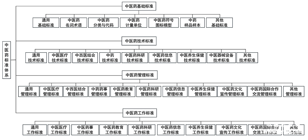 国家中医药管理局综合司关于印发《中医药标准体系表(2025年版)》的通知 国中医药综法监函〔2025〕269号 各省、自治区、直辖市中医药主管部门,新疆生产建设兵团卫生健康委,局机关各部门、直属各单位,全国中医药各专业标准化技术委员会,局中医药标准化工作办公室: 为进一步推动建立健全适合中医药发展的标准体系,促进标准化工作科学发展,清晰定位标准紧缺度、层级和优先级,我局组织制定了《中医药标准体系表(2025年版)》,现印发给你们,供指导中医药标准制修订工作。 国家中医药管理局综合司 2025年11月26日 中医药标准体系表(2025年版) 标准化是推进中医药治理能力和治理体系现代化的重要手段,对中医药事业高质量发展起着重要的基础性和引领性作用。构建标准体系是指导标准化工作科学发展的重要方法,对标准化工作有着重要的规划和引领作用。为进一步推动建立健全适合中医药发展的标准体系,促进标准化工作科学发展,我局组织制定了《中医药标准体系表(2025年版)》,用于指导中医药国家标准、行业标准制定紧密围绕中医药重点工作,清晰定位标准紧缺度、层级和优先级。《中医药标准体系表》是中医药领域制定标准的蓝图,也是今后一个时期编制中医药标准化规划、计划的基础和依据。 一、中医药标准体系框架设置 (一)总体结构。中医药标准体系分为基础标准、技术标准、管理标准和工作标准4个子体系,每一子体系下分为若干类目。主要的层次结构,如图1所示。 图1 中医药标准体系层次结构 (二)各层级内容说明。 1.中医药基础标准,是指在中医药范围内作为其他类别标准的基础并普遍使用,具有广泛指导意义的标准,是技术标准、管理标准和工作标准均通用的共性标准。包含7个类目,各类目内容说明见表1。 表1 中医药基础标准类目内容说明