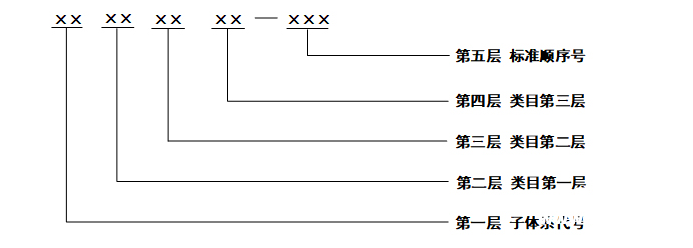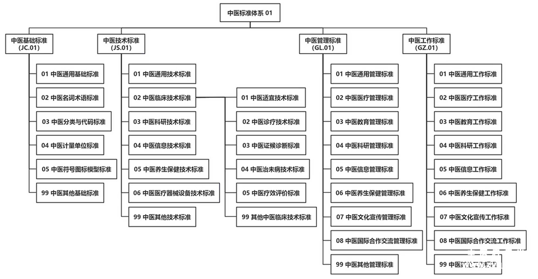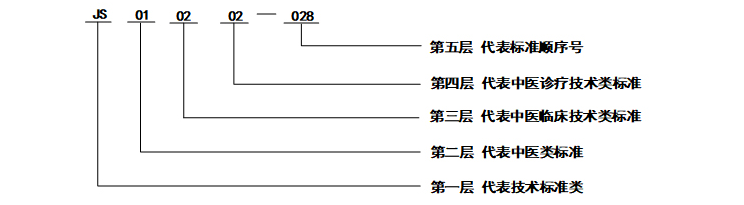 二、中医药标准体系编号规则 中医药标准体系的层次编号和标准代号采用二节式,以短横线分开,前面的是层次序列子体系代号和类目代号,后面的是顺序号。中医药标准体系编号结构如图2所示。 图2 中医药标准体系编号结构 第一层:按标准类别划分子体系,每个子体系采用关键词首字母缩写表示,其中:JC表示基础标准,JS表示技术标准,GL表示管理标准,GZ表示工作标准。 第二层:按照中医药行业的各专业领域划分,用2位阿拉伯数字表示。其中:00表示通用类标准,01表示中医类标准,02表示针灸类标准,03表示中医养生保健类标准,04表示中药类标准,05表示中药材种子种苗类标准,06表示中西医结合类标准,07表示中医药信息类标准,08表示中医药教育类标准,09表示中医药科研类标准,10表示中医文化类标准,11表示中医药国际合作交流类标准,99表示其他类标准。未来新增加的专业领域,则按照12、13……顺序编号。 第三层:按照中医药各专业领域下的业务类型进行划分,用2位阿拉伯数字表示。其中01表示通用类标准……99代表其他。 第四层:对各业务领域进一步细分,用2位阿拉伯数字表示,从01开始编码,99代表其他。如类目不存在,则以00补位。 第五层:标准顺序号位,用3位阿拉伯数字表示,从001开始编码。 例如:“中医四诊操作规范 第1部分 望诊(GB/T 40665.1-2021)”的中医药标准体系编号如图3所示: 图3 中医药标准体系编号(示例) 三、重点领域标准子体系结构 全国中医药各专业标准化技术委员会,应按照图1中医药标准体系层次结构,构建各自领域标准子体系(示例见图4),填写中医药标准明细表、中医药标准统计表(样式见附件1、2),报我局政策法规与监督司备案后实施。 图4 中医标准体系(示例) 附件1中医药标准明细表(例) 1