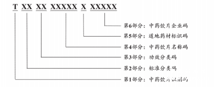 第4部分:中药饮片名称码,对中药饮片名称依次进行编码,用5位阿拉伯数字表示。国家标准收录的品种按照中药饮片名称拼音先后顺序依次编码;地方标准或其他标准收录的品种,按线上维护时间顺序依次编码。中药饮片名称不一致但基原一致的,赋相同的名称码。 第5部分:道地药材标识码,用1位阿拉伯数字表示。用"1"表示国家道地药材;用"2"表示省级道地药材;用"0"表示非道地药材或道地产地尚无标准。 第6部分:中药饮片企业码,用5位阿拉伯数字表示。直接为企业赋予的唯一企业代码,由企业在系统内维护信息获取。 |