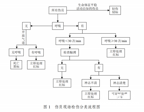 五项指标得分相加即为TI分值。TI分值范围为0~30分,分值越大,伤情越重。TI评分0~7分为轻伤,8~18分为中度伤,>18分为重伤。 GCS评分为评价颅脑损伤最常用的评分系统,三项相加计算总分,最高分为15分,最低分为3分。GCS分值13~15分为轻度颅脑损伤,9~12分为中度颅脑损伤,3~8分为重度颅脑损伤。 (二)医疗机构内救治阶段。 在医疗机构内救治阶段,通过急诊伤情评估和相关辅助检查,能够明确伤员的具体伤情诊断,这个环节创伤严重程度评估,主要采用简明损伤定级标准(Abbreviated Injury Scale,AIS)评估每一解剖部位损伤的严重程度,采用损伤严重度评分(InjurySeverity Score,ISS)评估多发伤的严重程度。 单发伤严重程度通过AIS评分进行评价,AIS>3分称为严重损伤。多发伤严重程度视ISS分值而定,ISS评分是将身体3个损伤最严重区域的最高AIS评分分值的平方相加所得,ISS>16分定为严重多发伤。 三、急救与转运 (一)现场急救与检伤分类。 1.检伤分类。 目的是合理利用事件现场有限的医疗救援人力、物力,对大量伤员进行及时有效的检查处置,挽救尽可能多的生命,最大限度减轻伤残程度,以及安全、迅速将全部伤员转运到有条件进一步治疗的医院。流程见图1。 | ||||||||||||||||||||||||||||||||||