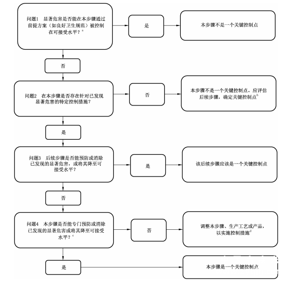图 A.1 确定关键控制点判断树 a 分析该危害的重要性(即在无控制措施的情况下出现该危害的可能性及其影响的严重性)以及是否能通过良好卫生规范等前提方案得到充分控制。良好卫生规范可以是常规性良好卫生规范,也可能是需要更多关注以控制危害的良好卫生规范(如监控和记录)。 b 如在问题2~4中未确定关键控制点,应调整生产工艺或产品以实施控制措施,并进行新的危害分析。 c 分析本步骤中的控制措施是否与另一步骤中的控制措施相结合以控制同一危害,这种情况下两个步骤都应被视为关键控制点。 d 完成新一次的危害分析后,回到判断树起始点。 表