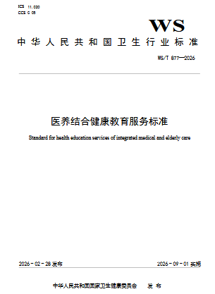 前言 本标准为推荐性标准。 本标准由国家卫生健康标准委员会老年健康标准专业委员会负责技术审查和技术咨询,由国家卫生健康委医疗管理服务指导中心负责协调性和格式审查,由国家卫生健康委老龄健康司负责业务管理、法规司负责统筹管理。 本标准起草单位:中国健康教育中心、北京大学公共卫生学院、北京医院(国家老年医学中心)、山东第一医科大学附属省立医院、广东省中医院、浙江大学医学院附属第四医院。 本标准主要起草人:李英华、吴敬、聂雪琼、程玉兰、常春、齐海梅、王建春、李新梅、张华芳、田向阳。 WS/T 877—2026 医养结合健康教育服务标准