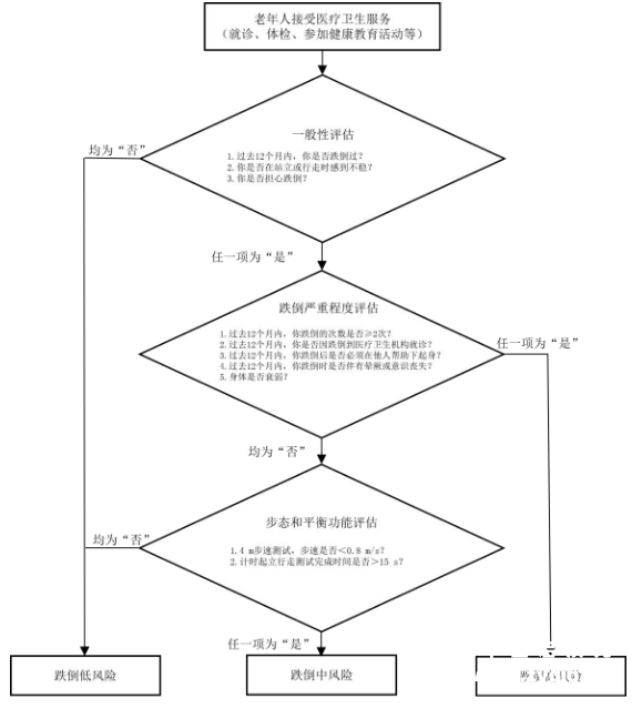 5.2.2 老年人跌倒风险评估和分级流程图见图 1。 图 1 老年人跌倒风险评估和分级流程图 5.3 风险分级实施 5.3.1 每年宜对老年人进行至少一次跌倒风险评估和分级,宜对跌倒高风险老年人增加跌倒风险评估的频次。 5.3.2 老年人发生跌倒后,或现患疾病病情加重,或新确诊患病,或增加用药种类或剂量时宜进行一次跌倒风险评估。 5.3.3 参照附录 E 中表 E.1 记录老年人跌倒风险评估结果,将评估结果记录在老年人健康档案或诊疗记录中,并告知老年人及其照护者。