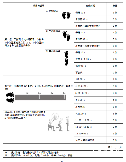B.3 医疗机构老年人简易体能状况量表 表B.3规定了简易体能状况评估的内容。 表 B.3 简易体能状况量表 B.4 医疗机构老年人视力简易评估表 表B.4规定了视力简易评估的内容。 表 B.4 视力简易评估表