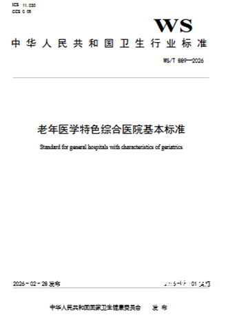 ——关于发布《老年人认知障碍预防干预技术标准》等7项推荐性卫生行业标准的通告(国卫通〔2026〕2 号) 第7项 前言 本标准为推荐性标准。 本标准由国家卫生健康标准委员会老年健康标准专业委员会负责技术审查和技术咨询,由国家卫生健康委医疗管理服务指导中心负责协调性和格式审查,由国家卫生健康委老龄健康司负责业务管理、法规司负责统筹管理。 本标准起草单位:中国老年医学学会、北京老年医院、江苏省老年医学学会、辽宁省金秋医院、洛阳新里程医院、丽水市第二人民医院、福建省老年医院、郑州市第九人民医院(郑州市老年医院)。 本标准主要起草人:陈峥、宋岳涛、许家仁、禹震、暴继敏、贺向无、吴绍长、曾庆新、李敏、毕宪国。 WS/T 889—2026 老年医学特色综合医院基本标准 1 范围 本标准明确了二级、三级综合医院发展老年医学特色的基本原则,规定了有关科室及功能区设置、床位数量、人员配备、建筑设施、医疗设备配置、制度建设与培训、文化建设、信息化建设的基本要求。 本标准适用于二级、三级综合医院发展老年医学特色的活动。 2 规范性引用文件 下列文件中的内容通过文中的规范性引用而构成本标准必不可少的条款。其中,注日期的引用文件,仅该日期对应的版本适用于本标准;不注日期的引用文件,其最新版本(包括所有的修改单)适用于本标准。 GB/T 10001.1 公共信息图形符号 第 1 部分:通用符号 GB/T 10001.9 公共信息图形符号 第 9 部分:无障碍设施符号 GB 50763 无障碍设计规范 WS 444.1 医疗机构患者活动场所及坐卧设施安全要求 第1部分:活动场所 WS/T 844 老年安宁疗护病区设置标准 3 术语和定义 下列术语和定义适用于本标准。 3.1综合医院 general hospital 有一定数量的病床,分设内科、外科、妇科、儿科、眼科、耳鼻喉科等各种临床科室及药剂、检验、放射等医技部门,拥有相应人员、设备的医院。 注:医院级别符合属地卫生行政主管部门设置,二级医院床位数在 100~499 张,三级医院床位数不少于 500 张。 3.2老年医学特色综合医院 general hospital with characteristics of geriatrics 以老年患者为主要服务对象,提供诊断、治疗、护理、康复、安宁疗护等连续性医疗服务,并承担健康科普、预防保健、疫情防控等公共卫生职能和服务的综合医院。 3.3老年医学科医师 geriatrician 经卫生健康行政部门审核注册,取得医师执业资格,并经过老年医学相关培训,从事老年医学专业的医师。 3.4个案管理服务 case management service 为有复杂医疗、照护需求的老年人,通过评估和整合服务资源,制定个性化照护计划并全程协调、监督、评价,以保障老年人获得连续、高效、适宜的专业化服务。 3.5医疗护理员 medical nursing assistant 对患者和其他需要照护的人群提供生活照护,并在医务人员的指导下进行部分辅助工作的人员。 4 基本原则 4.1 以老年人健康为中心,提供规范化的健康教育、预防保健、疾病诊治、康复护理、长期照护、安宁疗护服务。 4.2 符合老年友善的环境、设施、设备、文化和服务标准。 4.3 提供个案管理、老年综合评估和多学科整合服务。 4.4 以功能恢复和维持最佳生活质量为目的。 4.5 提供全程管理,实现与各级医疗机构、医养结合机构及其他中长期照护机构间的有序衔接。 5 老年医学特色二级综合医院基本要求 5.1 床位 5.1.1 医院总床位数量符合二级综合医院基本要求。 5.1.2 老年医学科、康复医学科、长期护理病区(房)、安宁疗护病区(房)等老年相关科室总床位数累计应不少于 50 张。 5.2 科室及功能区设置 5.2.1 科室设置 5.2.1.1 除应满足二级综合医院基本要求外,应至少设置老年医学科、安宁疗护病区(房)、精神心理科(室)、中医科、康复医学科、营养科(室)。 5.2.1.2 宜设置肿瘤科、重症医学科(室)、医学社会工作部。 5.2.2 门诊区 5.2.2.1 应设置老年医学科门诊、老年用药咨询门诊、老年综合评估门诊。 5.2.2.2 应设置康复医学科门诊。 5.2.2.3 宜设置老年护理门诊。 5.2.3 住院病区 5.2.3.1 应设置老年医学科病房、康复医学科病房、安宁疗护病区(房),宜设置中医科病房。 5.2.3.2 老年医学科病区内宜设置康复训练活动室、综合评估室、助浴室、谵妄照护室。 5.2.3.3 安宁疗护病区(房)应按 WS/T 844 的要求设置。 5.2.3.4 宜设置长期护理病区(房)。 |